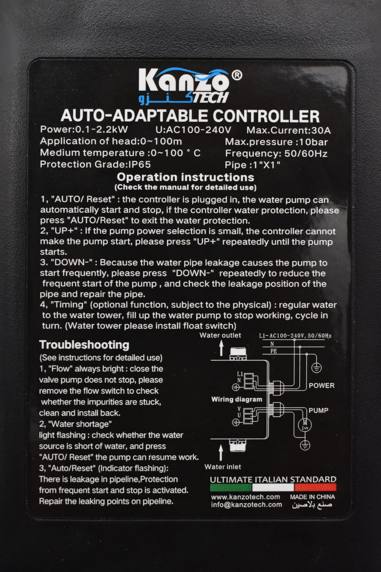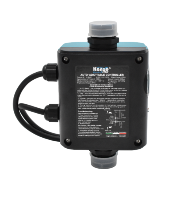 KANZO PS-08X Intelligent Pressure Controller (IPC) is a cutting-edge device designed to optimize water pump performance, ensuring efficient and reliable pressure management. This advanced controller regulates pump operation, maintaining consistent pressure and flow rates, while minimizing energy consumption. This pressure controller widely workable with different type of pump. It includes deep well submersible pump for self-priming, and also automatically sense the maximum pressure of pump, and then to set by certain percentage of max. pressure as “starting” pressure automatically and also manual setting of starting pressure in auto mode.